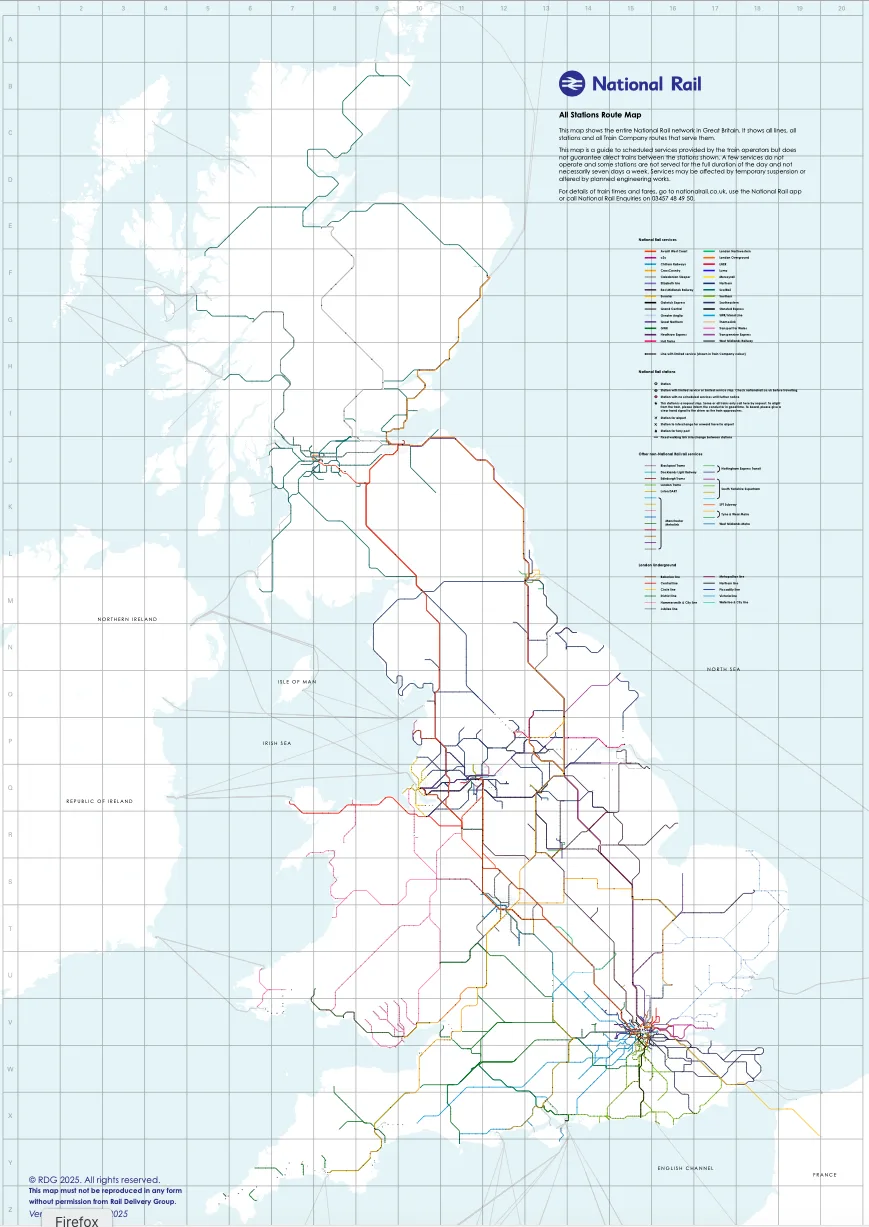 We have a Principal Route Map which shows a high-level overview of the main routes in Britain and an All Stations Route Map which shows every station, every line and every train company that serves the routes. It also shows all non-National Rail tram and metro networks. Both of these can be downloaded as a pdf document.